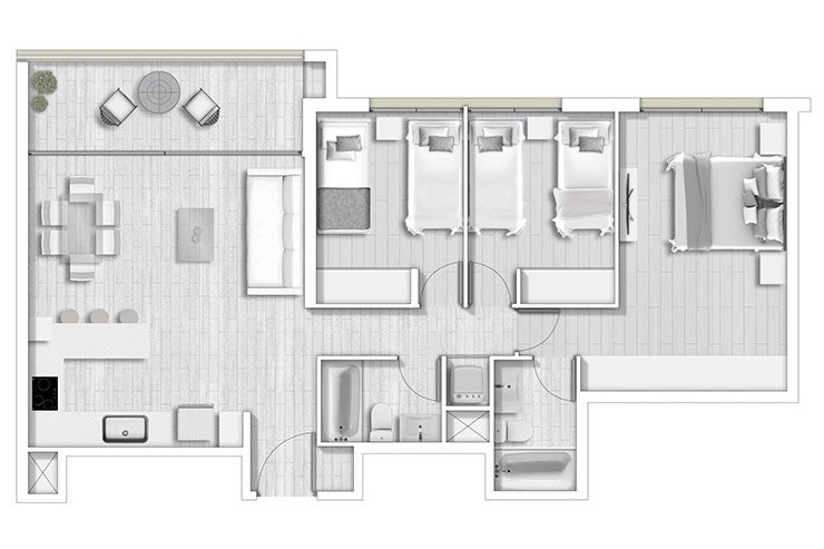 • Cocina integrada y equipada (campana, horno, encimera vitrocerámica)